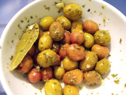 Colocar as azeitonas numa taça, juntar os alhos partidos finamente, louro, oregãos e azeite. Mexer tudo muito bem, para distribuir os temperos por todas as azeitonas.