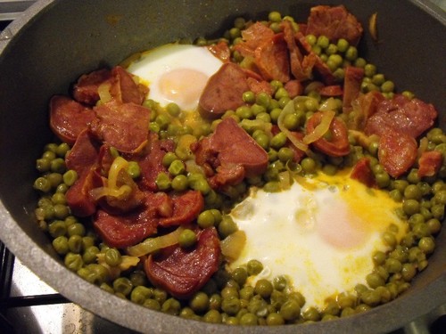 Quando as ervilhas estiverem quase cozidas com ajuda de duas colheres abrir um espaço para colocar o ovo a escalfar. Deixar cozinhar até os ovos estarem cozidos e com pouco molho. No momento de servir polvilhar com coentros picados.