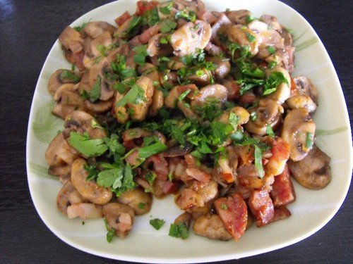 Limpar os cogumelos. Numa frigideira coloque os alhos e os cogumelos fatiados, chouriço e bacon aos pedaços, tempere com sal marinho, pimenta e no fim regue tudo com o azeite.